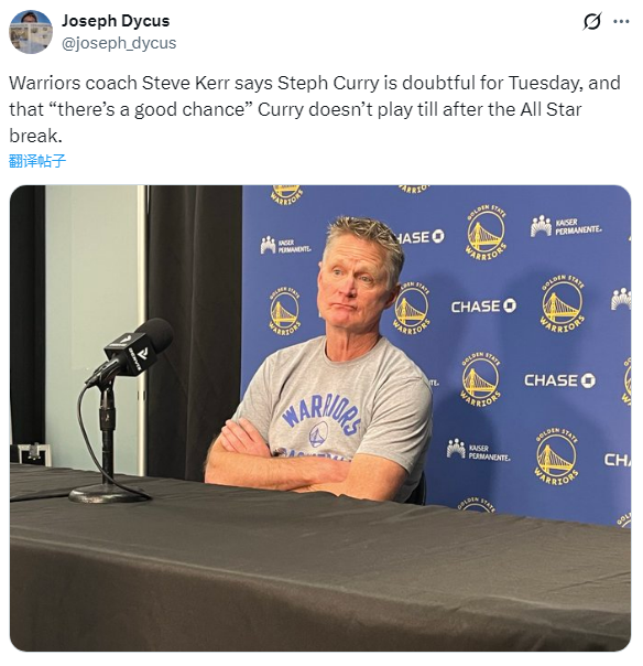 对于库里的伤情,此前勇士随队记者Anthony Slater报道,库里的膝盖有一些隐痛、肿胀,几周前对阵森林狼时伤情突然加重,预计他会很谨慎。